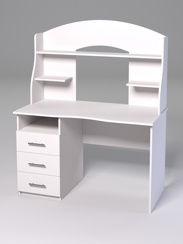 Офисный компьютерный стол предназначен для организации рабочего места и комфортной работы оператора, менеджера, делопроизводителя, секретаря. Может также использоваться для письменной работы. Стол оборудован тумбой с отделением и тремя выдвижными ящиками. Сверху имеется надстройка с боковыми и центральной полками.