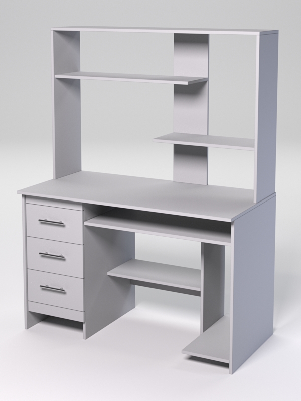 Офисный компьютерный стол подойдет для организации рабочего места и комфортной работы оператора, менеджера, делопроизводителя, секретаря. Стол оборудован полкой под клавиатуру, подставкой под системный блок, полкой для хранения, тремя выдвижными ящиками. Сверху находится надстройка с двумя полками.