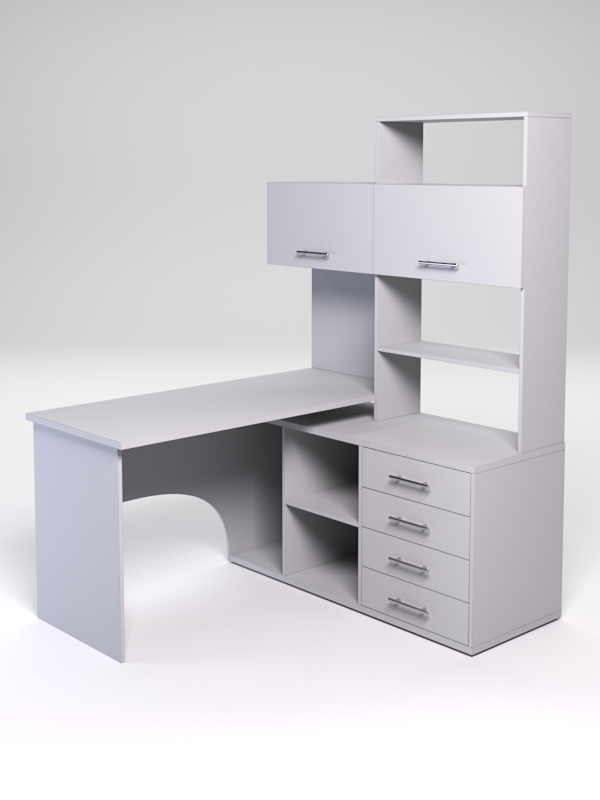 Офисный компьютерный стол подойдет для организации рабочего места оператора, менеджера, делопроизводителя, секретаря. Универсальная конструкция стола позволяет использовать его для письменных работ, а также для размещения офисной техники и хранения документов. Стол оборудован тумбой с отделениями под системный блок, секциями для хранения и четырьмя выдвижными ящиками. Сверху имеется надстройка с полками и двумя шкафчиками.