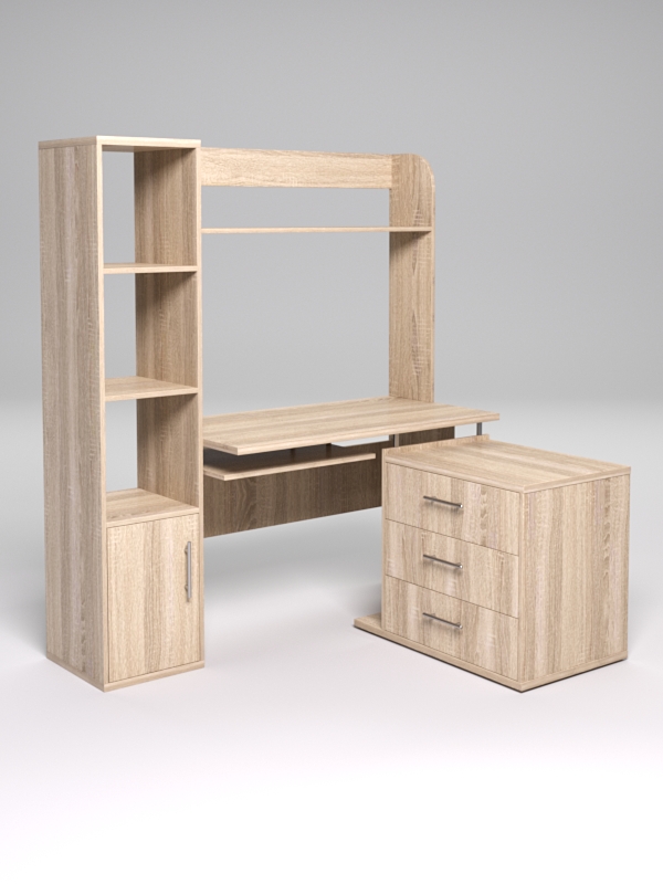 Офисный компьютерный стол подойдет для организации рабочего места оператора, менеджера, делопроизводителя, секретаря. Универсальная конструкция стола позволяет использовать его для письменных работ, а также для размещения офисной техники и хранения документов. Стол оборудован тумбой с тремя выдвижными ящиками и подставкой под системный блок, полкой под клавиатуру, стеллажом и надстройкой.