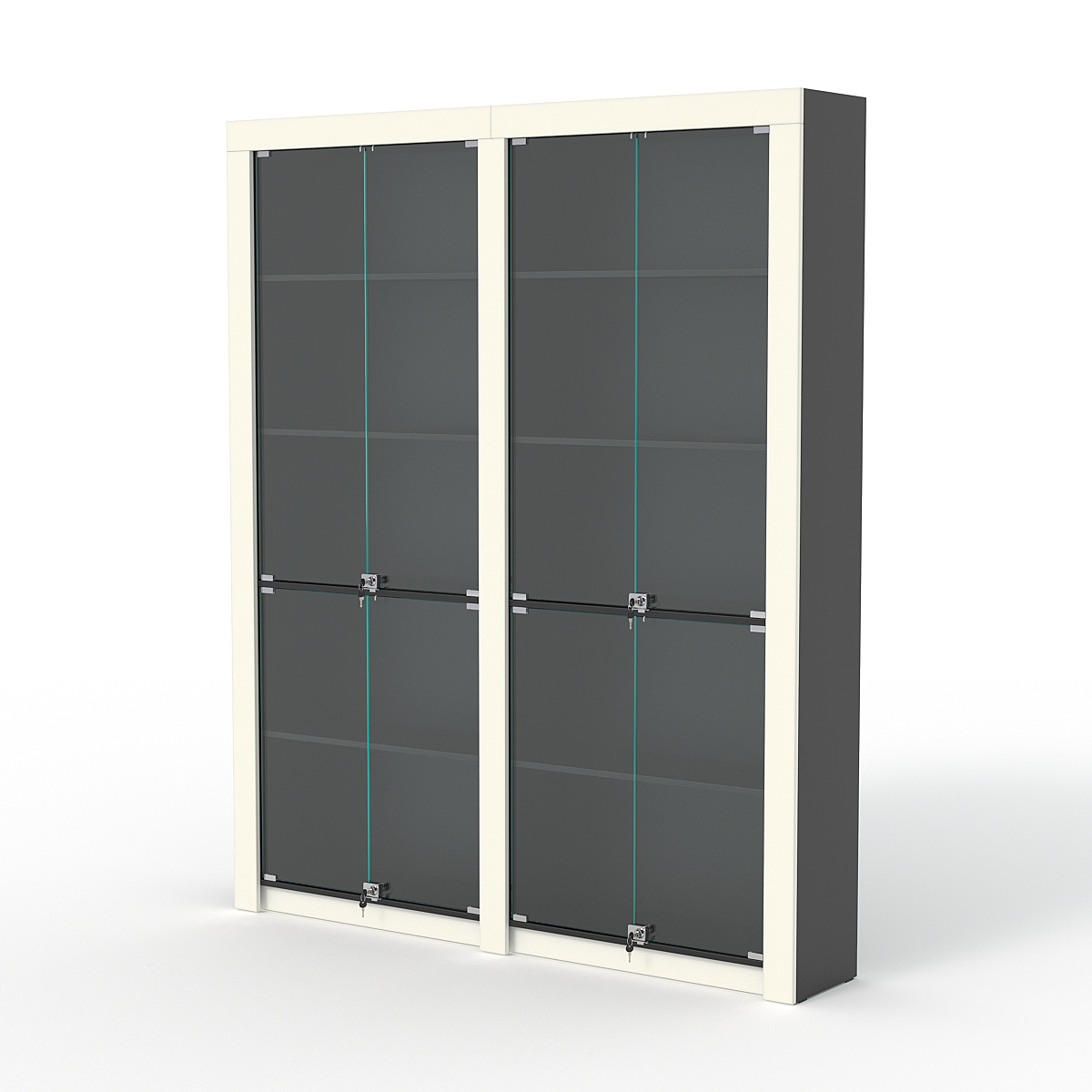 Комплект состоит из двух стеллажей. Каждый стеллаж имеет 4 полки. Каркас выполнен из ДСП. Передняя граница стеллажа отделана черной кромкой.