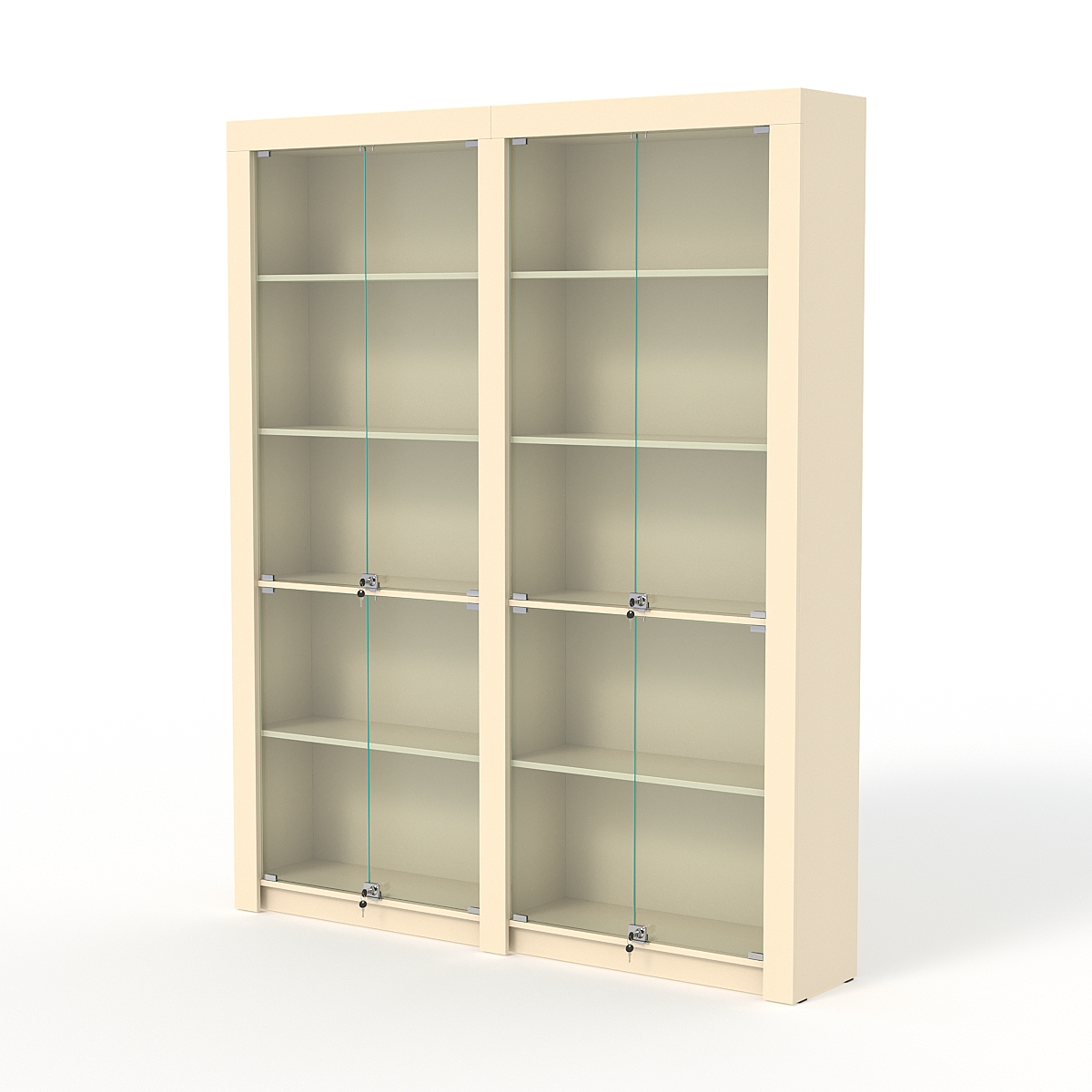 Комплект состоит из двух стеллажей. Каждый стеллаж имеет 4 полки. Каркас выполнен из ДСП. Передняя граница стеллажа отделана черной кромкой.