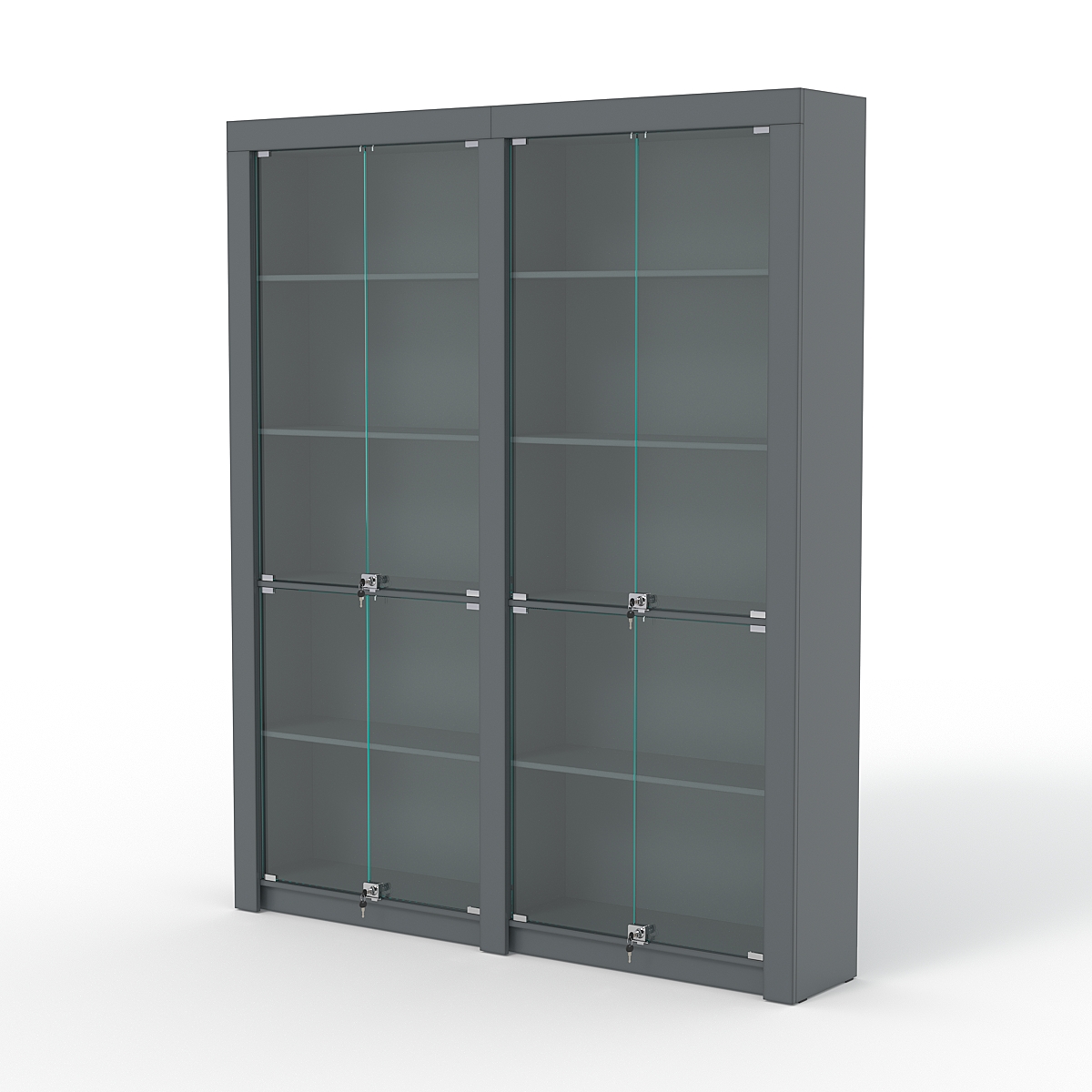 Комплект состоит из двух стеллажей. Каждый стеллаж имеет 4 полки. Каркас выполнен из ДСП. Передняя граница стеллажа отделана черной кромкой.