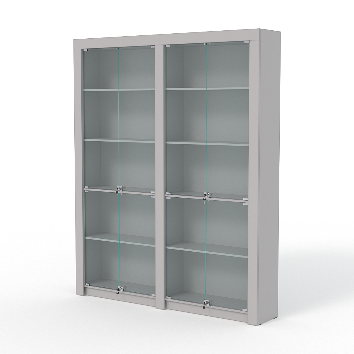 Комплект состоит из двух стеллажей. Каждый стеллаж имеет 4 полки. Каркас выполнен из ДСП. Передняя граница стеллажа отделана черной кромкой.