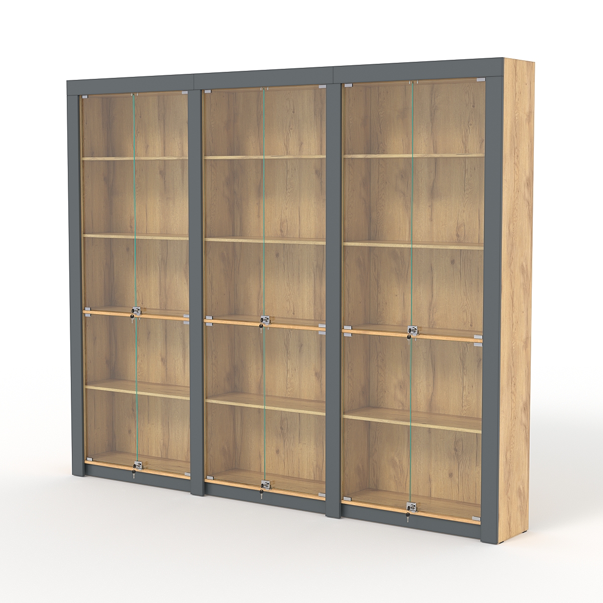 Комплект стеллажей из ДСП «Модерн» №2 — универсальное торговое оборудование для любых целей. Его можно разместить в магазине, в офисе, в учебном заведении, кафе, в библиотеке и т.д. В нем 3 отделения по 5 полок в каждом, на которые можно поместить любые малогабаритные вещи.