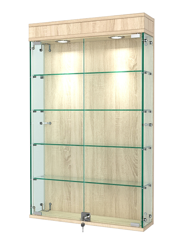Данная модель включает четыре стеклянные полки и распашные дверки, закрывающиеся на ключ. Верхняя подсветка делает витрину ярче, а ее содержимое — заметнее.