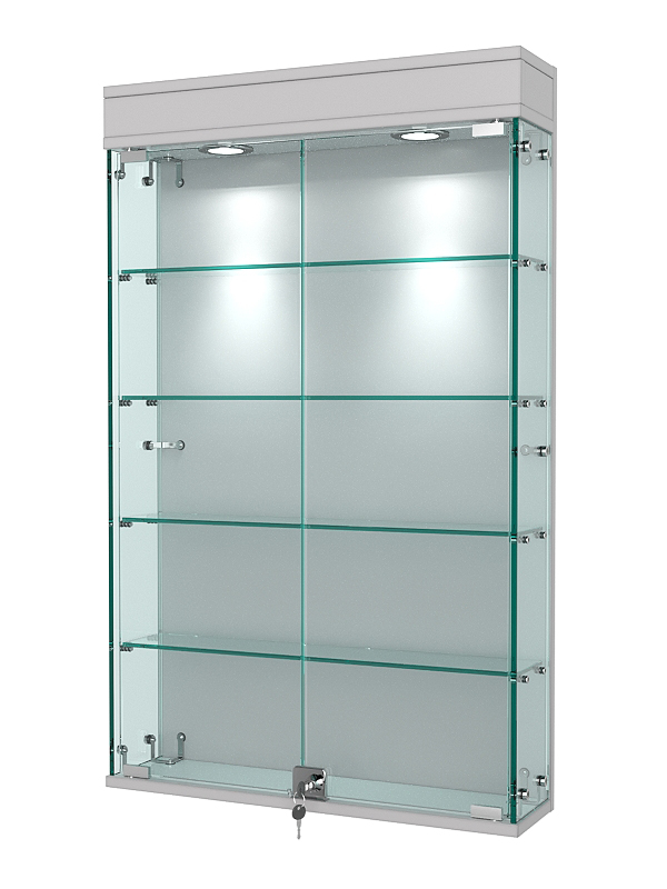 Данная модель включает четыре стеклянные полки и распашные дверки, закрывающиеся на ключ. Верхняя подсветка делает витрину ярче, а ее содержимое — заметнее.
