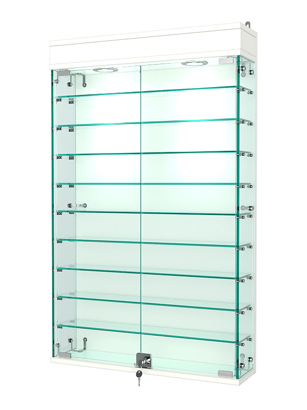 Данная модель включает девять стеклянных полок и распашные дверки, закрывающиеся на ключ. Верхняя подсветка делает витрину ярче, а ее содержимое — заметнее.