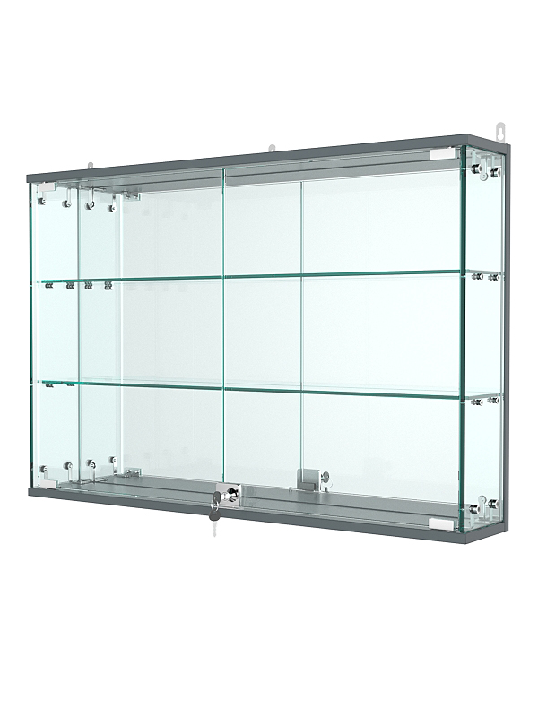 Данная модель включает две стеклянные полки и распашные дверки, закрывающиеся на ключ. Отличительная деталь — зеркальная задняя панель, позволяющая рассмотреть товар со всех сторон.