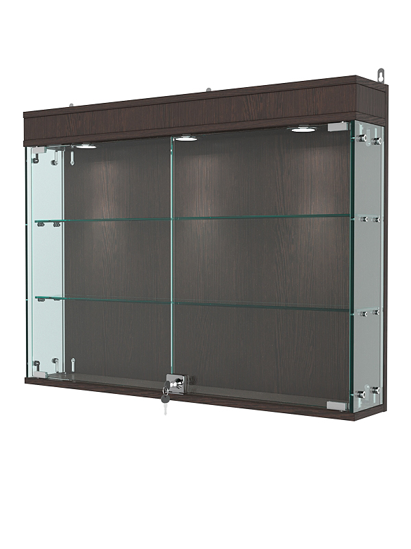 Данная модель включает две стеклянные полки и распашные дверки, закрывающиеся на ключ. Верхняя подсветка делает витрину ярче, а ее содержимое — заметнее.