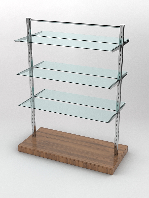 Данная модель включает основание и две металлические стойки, на которые крепятся три стеклянные полки. Вверху стойки соединяются металлическим стержнем. Стойки изготовлены из квадратной перфорированной трубы. Перфорация позволяет менять высоту полок.