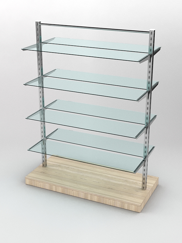 Данная модель включает основание и две металлические стойки, на которые крепятся четыре стеклянные полки. Вверху стойки соединяются металлическим стержнем. Стойки изготовлены из квадратной перфорированной трубы. Перфорация позволяет менять высоту полок.