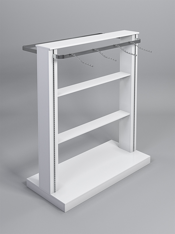 Гондола представляет из себя П-образную конструкцию, выполненную из ЛДСП, на каркасе из металлических перфорированных Т-образных стоек. Наверху, с одной стороны располагается штанга для плечиков, с другой кронштейны.Есть возможность докупить дополнительные кронштейны или крючки для размещения на этом оборудовании, с целью увеличения торгового пространства (по согласованию с менеджерами).