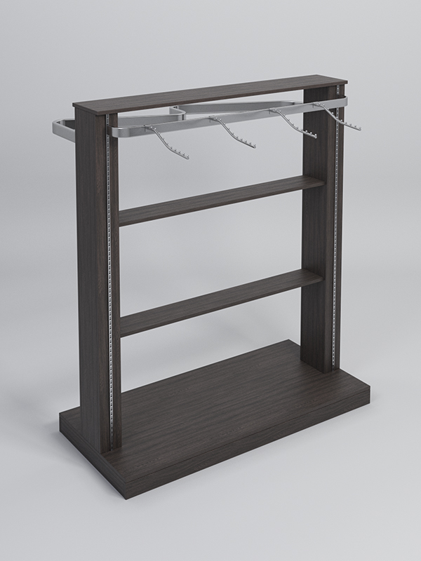 Гондола представляет из себя П-образную конструкцию, выполненную из ЛДСП, на каркасе из металлических перфорированных Т-образных стоек. Наверху, с одной стороны располагается изогнутая штанга для плечиков, с другой кронштейны.(предполагаются разные вариации.) Есть возможность докупить дополнительные кронштейны или крючки для размещения на этом оборудовании, с целью увеличения торгового пространства (согласовывайте с менеджерами)