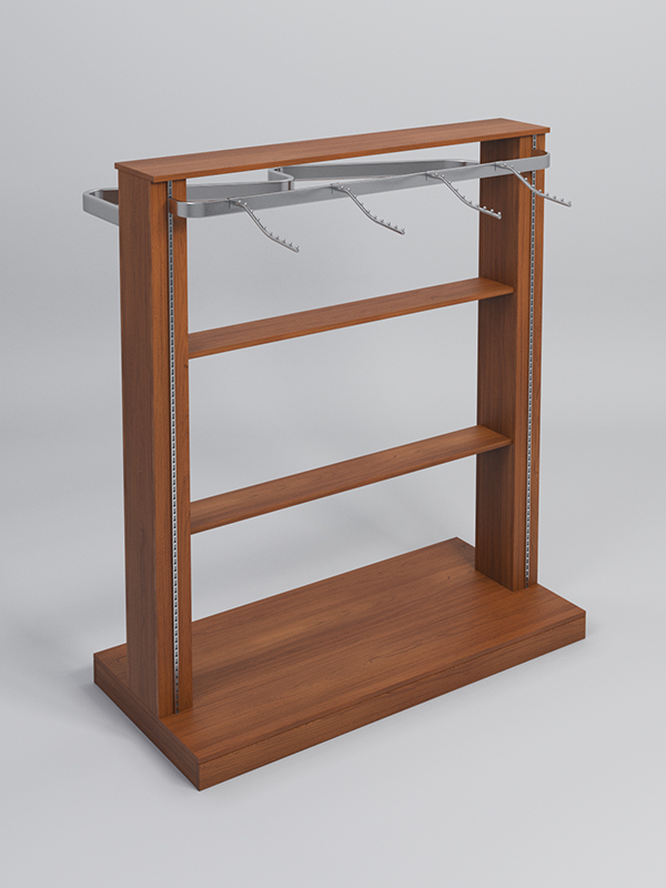 Гондола представляет из себя П-образную конструкцию, выполненную из ЛДСП, на каркасе из металлических перфорированных Т-образных стоек. Наверху, с одной стороны располагается изогнутая штанга для плечиков, с другой кронштейны.(предполагаются разные вариации.) Есть возможность докупить дополнительные кронштейны или крючки для размещения на этом оборудовании, с целью увеличения торгового пространства (согласовывайте с менеджерами)