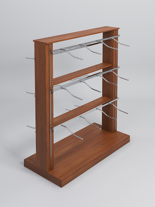 Гондола представляет из себя П-образную конструкцию, выполненную из ЛДСП, на каркасе из металлических перфорированных Т-образных стоек. Три яруса со штангами по обе стороны под кронштейны для размещения товара.