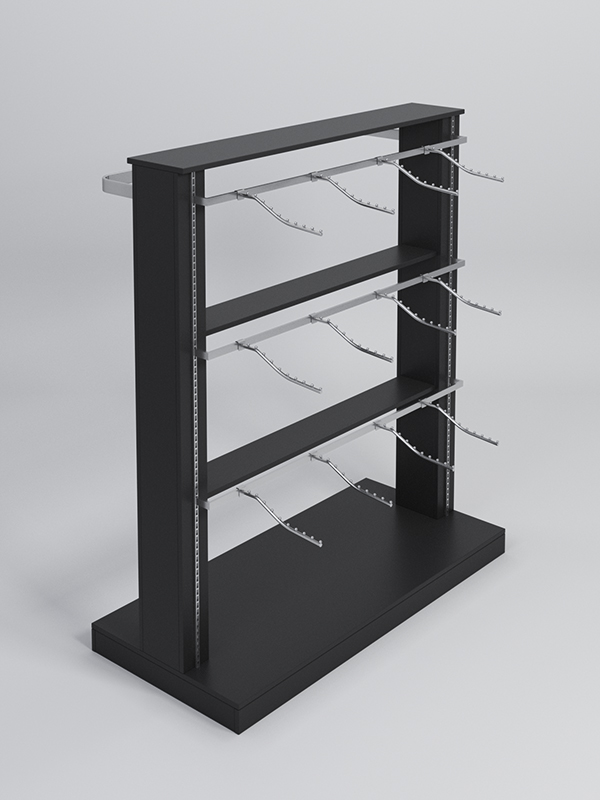 Гондола представляет из себя П-образную конструкцию, выполненную из ЛДСП, на каркасе из металлических перфорированных Т-образных стоек. Три яруса с кронштейнами для размещения товара с одной стороны и поручень для плечиков с другой.