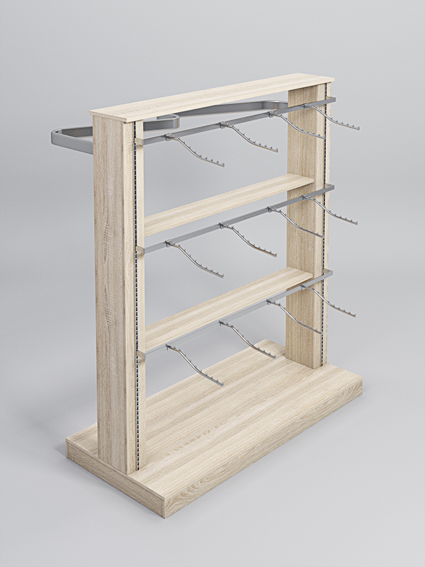 Гондола представляет из себя П-образную конструкцию, выполненную из ЛДСП, на каркасе из металлических перфорированных Т-образных стоек. Три яруса с кронштейнами для размещения товара с одной стороны и изогнутый поручень для плечиков с другой.