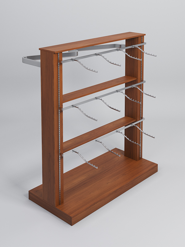 Гондола представляет из себя П-образную конструкцию, выполненную из ЛДСП, на каркасе из металлических перфорированных Т-образных стоек. Три яруса с кронштейнами для размещения товара с одной стороны и изогнутый поручень для плечиков с другой.