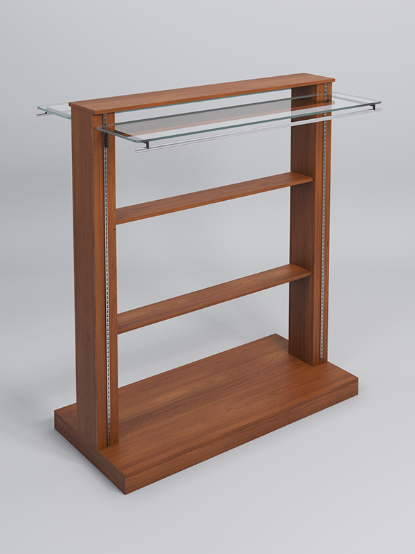 Гондола представляет из себя П-образную конструкцию, выполненную из ЛДСП, на каркасе из металлических перфорированных Т-образных стоек. 2 стеклянные полки и две штанги для плечиков.