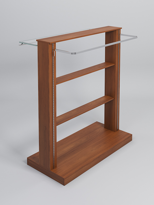 Гондола представляет из себя П-образную конструкцию, выполненную из ЛДСП, на каркасе из металлических перфорированных Т-образных стоек. Стеклянная полка и две штанги для плечиков.