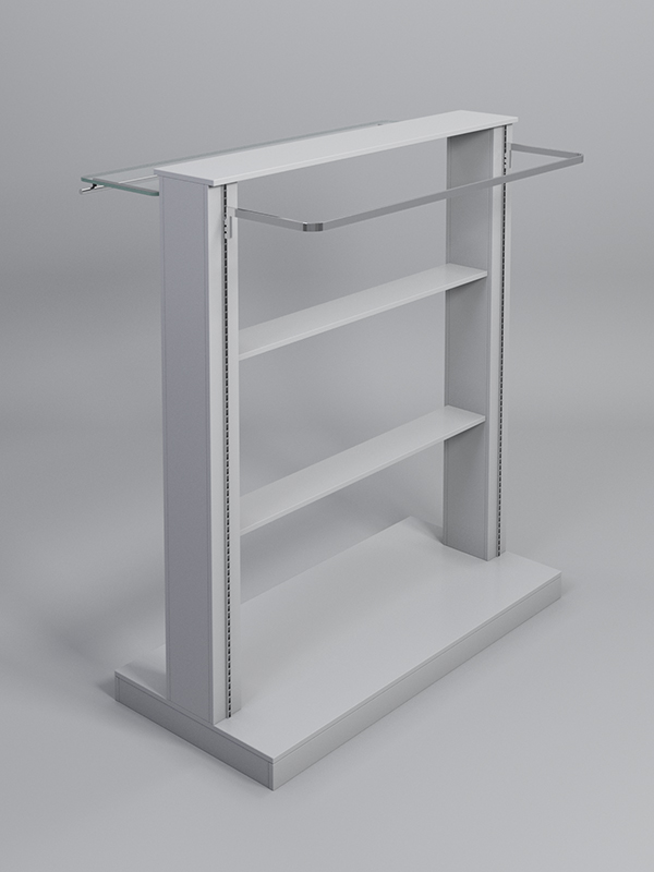 Гондола представляет из себя П-образную конструкцию, выполненную из ЛДСП, на каркасе из металлических перфорированных Т-образных стоек. Стеклянная полка и две штанги для плечиков.