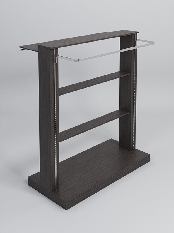 Гондола представляет из себя П-образную конструкцию, выполненную из ЛДСП, на каркасе из металлических перфорированных Т-образных стоек.Полка из ЛДСП, поручень и штанга для плечиков.