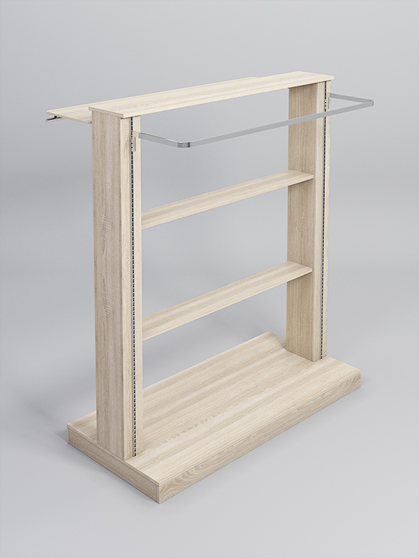 Гондола представляет из себя П-образную конструкцию, выполненную из ЛДСП, на каркасе из металлических перфорированных Т-образных стоек.Полка из ЛДСП, поручень и штанга для плечиков.