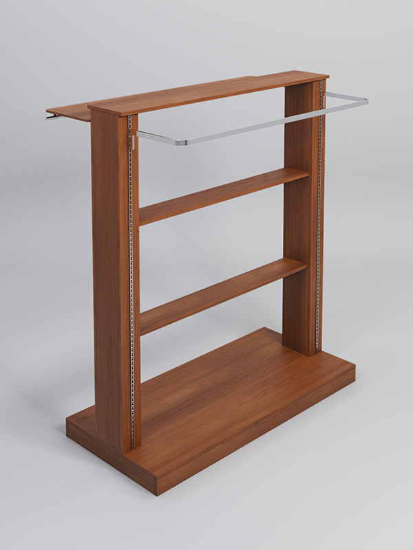 Гондола представляет из себя П-образную конструкцию, выполненную из ЛДСП, на каркасе из металлических перфорированных Т-образных стоек.Полка из ЛДСП, поручень и штанга для плечиков.
