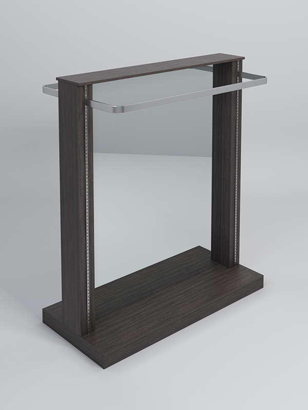 Гондола представляет из себя П-образную конструкцию, выполненную из ЛДСП, на каркасе из металлических перфорированных Т-образных стоек, между которыми расположено двустороннее зеркало.Наверху, по обе стороны располагаются штанги для плечиков.