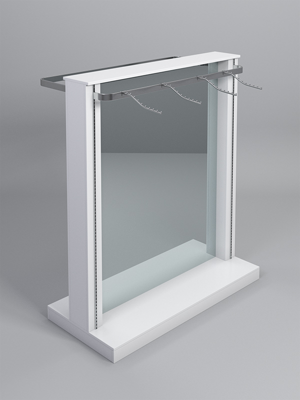 Гондола представляет из себя П-образную конструкцию, выполненную из ЛДСП, на каркасе из металлических перфорированных Т-образных стоек, между которыми расположено двустороннее зеркало.Наверху, с одной стороны располагаются кронштейны , а с другой штанга для плечиков.