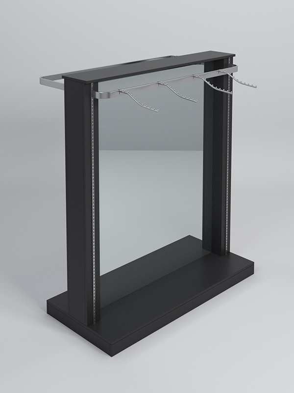 Гондола представляет из себя П-образную конструкцию, выполненную из ЛДСП, на каркасе из металлических перфорированных Т-образных стоек, между которыми расположено двустороннее зеркало.Наверху, с одной стороны располагаются кронштейны , а с другой штанга для плечиков.