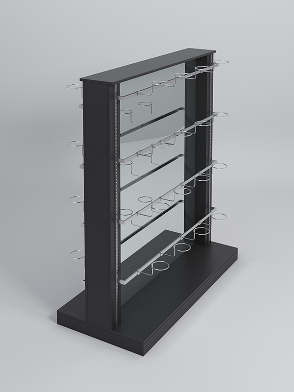 Гондола представляет из себя П-образную конструкцию, выполненную из ЛДСП, на каркасе из металлических перфорированных Т-образных стоек, между которыми расположено двустороннее зеркало.По 4 штанги с двух сторон с кронштейнами для головных уборов.