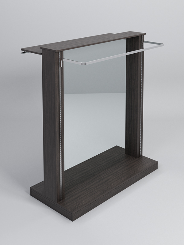 Гондола представляет из себя П-образную конструкцию, выполненную из ЛДСП, на каркасе из металлических перфорированных Т-образных стоек, между которыми расположено двустороннее зеркало.1 полка из ЛДСП и две штанги для плечиков.