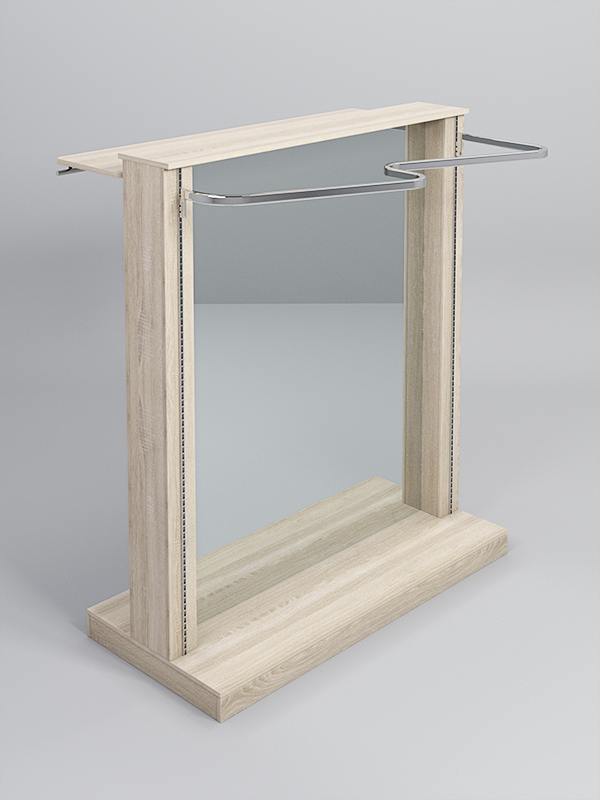 Гондола представляет из себя П-образную конструкцию, выполненную из ЛДСП, на каркасе из металлических перфорированных Т-образных стоек, между которыми расположено двустороннее зеркало.1 полка из ЛДСП, 1 прямая и 1 изогнутая штанга для плечиков.