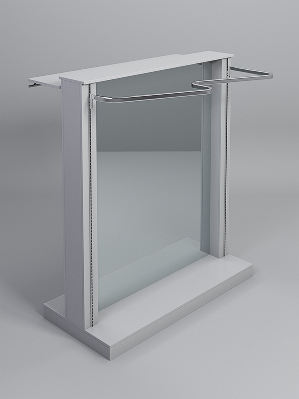 Гондола представляет из себя П-образную конструкцию, выполненную из ЛДСП, на каркасе из металлических перфорированных Т-образных стоек, между которыми расположено двустороннее зеркало.1 полка из ЛДСП, 1 прямая и 1 изогнутая штанга для плечиков.