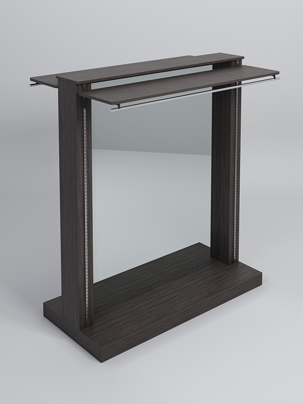 Гондола представляет из себя П-образную конструкцию, выполненную из ЛДСП, на каркасе из металлических перфорированных Т-образных стоек, между которыми расположено двустороннее зеркало.В представленной комплектации: две полки из ЛДСП, две штанги для плечиков.