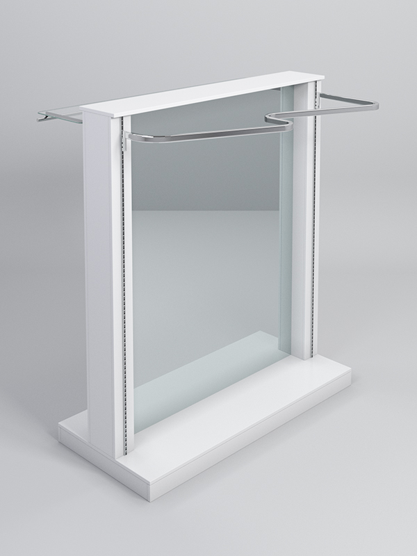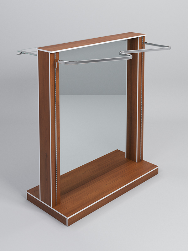 Гондола представляет из себя П-образную конструкцию, выполненную из ЛДСП, на каркасе из металлических перфорированных Т-образных стоек, между которыми расположено двустороннее зеркало.В представленной комплектации: стеклянная полка, штанга и изогнутый поручень для плечиков, подиум.