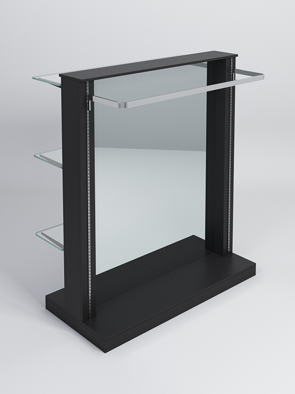 Гондола представляет из себя П-образную конструкцию, выполненную из ЛДСП, на каркасе из металлических перфорированных Т-образных стоек, между которыми расположено двустороннее зеркало.В представленной комплектации: три стеклянные полки,поручень для плечиков, подиум.