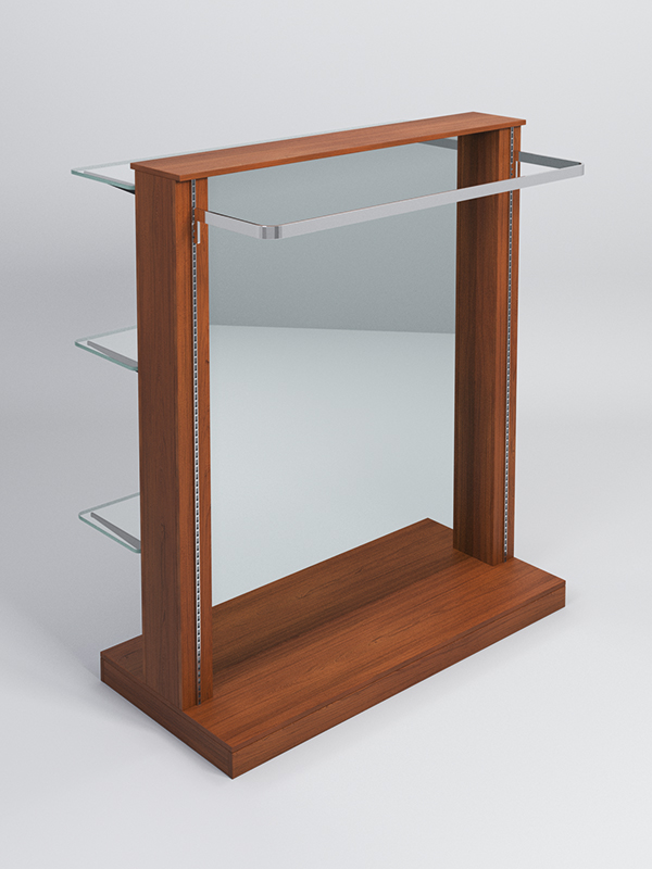 Гондола представляет из себя П-образную конструкцию, выполненную из ЛДСП, на каркасе из металлических перфорированных Т-образных стоек, между которыми расположено двустороннее зеркало.В представленной комплектации: три стеклянные полки,поручень для плечиков, подиум.