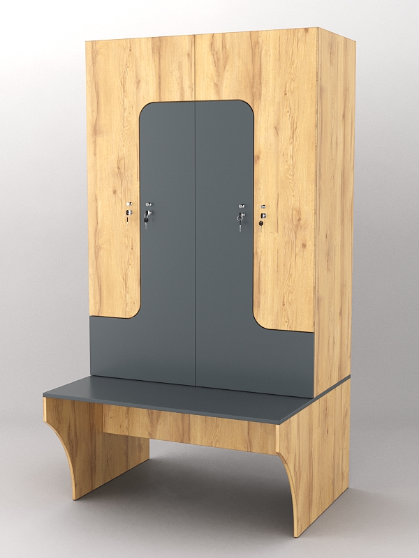 Шкаф четырехсекционный, рассчитан на двоих посетителей. Скамейка в комплекте.