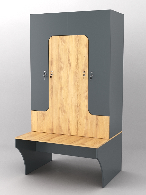Шкаф четырехсекционный, рассчитан на двоих посетителей. Скамейка в комплекте.