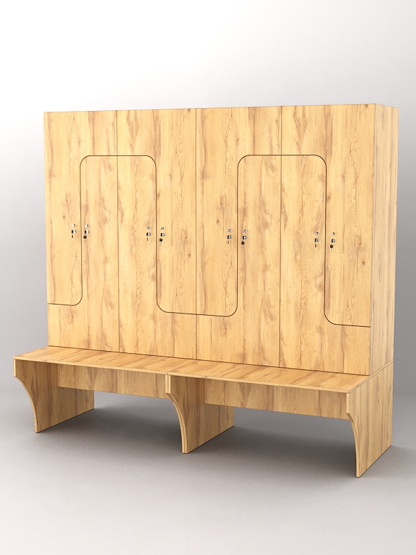 Шкаф четырехсекционный, рассчитан на четверых посетителей. Скамейка в комплекте