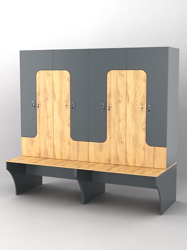 Шкаф четырехсекционный, рассчитан на четверых посетителей. Скамейка в комплекте