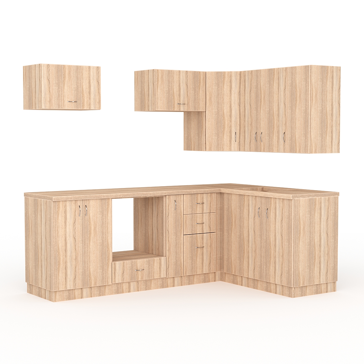 Оснащена ящиками. Ящики в кухонной гарнитуре используются для хранения посуды, кухонных принадлежностей и других предметов, которые могут понадобиться при приготовлении пищи.