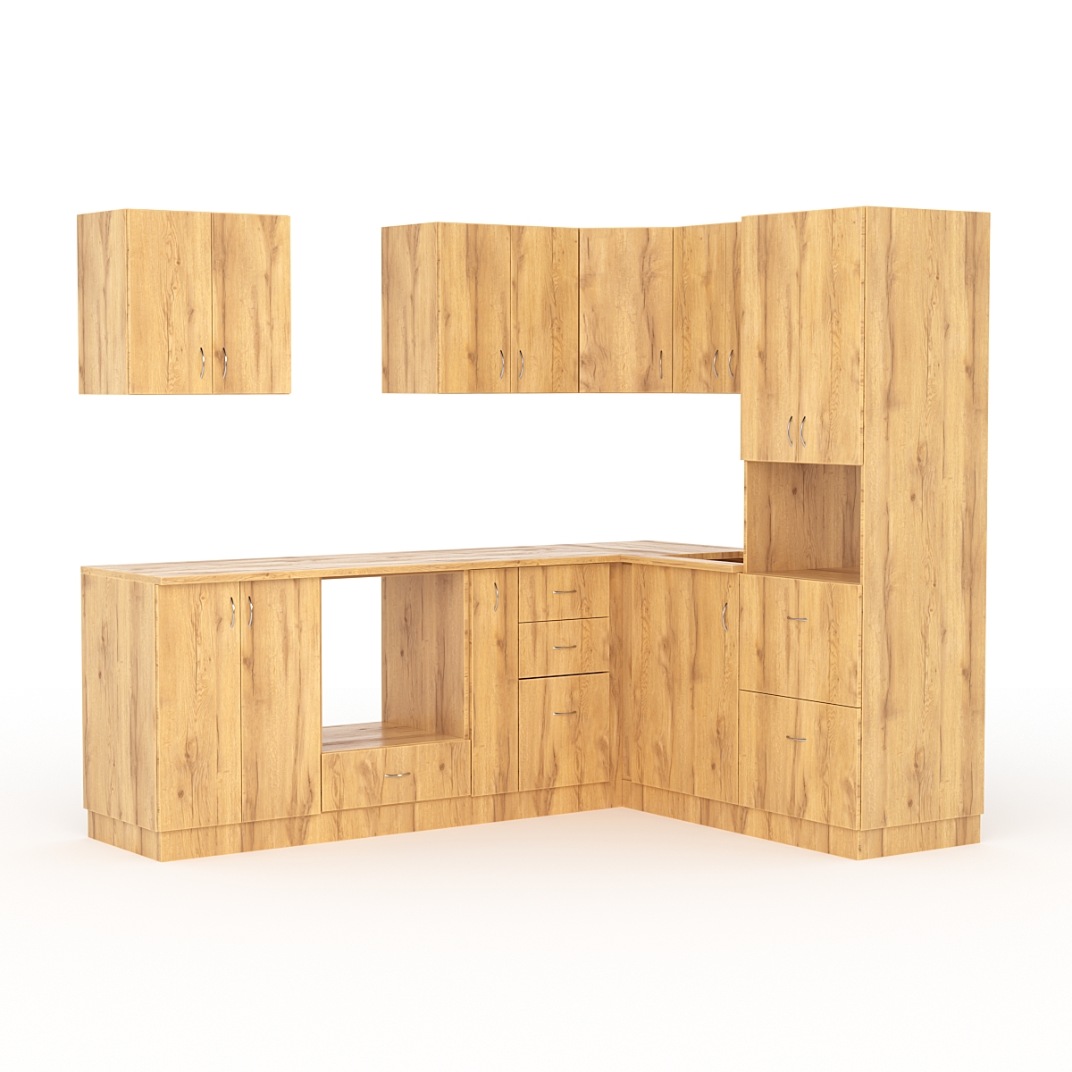 Оснащена ящиками. Ящики в кухонной гарнитуре используются для хранения посуды, кухонных принадлежностей и других предметов, которые могут понадобиться при приготовлении пищи.