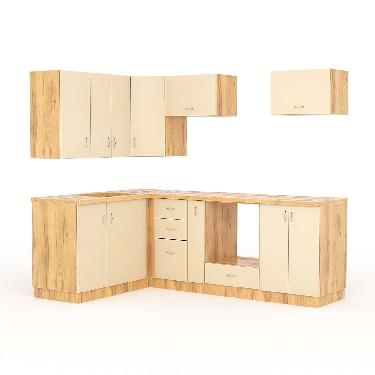 Кухонная гарнитура со столешницей — это комплект мебели для кухни, который включает в себя нижние и верхние шкафы, а также рабочую поверхность (столешницу). Размещается в углу. Столешница является важной частью кухонной гарнитуры, так как она служит рабочей поверхностью для приготовления пищи. Оборудование позволяет организовать пространство кухни, создать удобную рабочую зону и место для хранения посуды, продуктов и кухонных принадлежностей. Кухонная гарнитура используется для обустройства кухни в жилых домах, квартирах, офисах и других помещениях, где есть необходимость в приготовлении пищи.