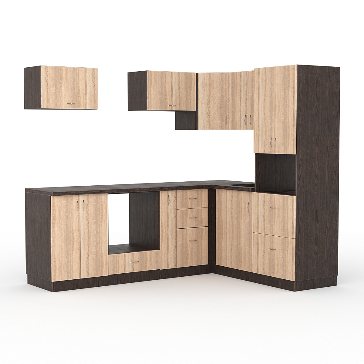Система оснащена ящиками. Ящики в кухонной гарнитуре используются для хранения посуды, кухонных принадлежностей и других предметов, которые могут понадобиться при приготовлении пищи.