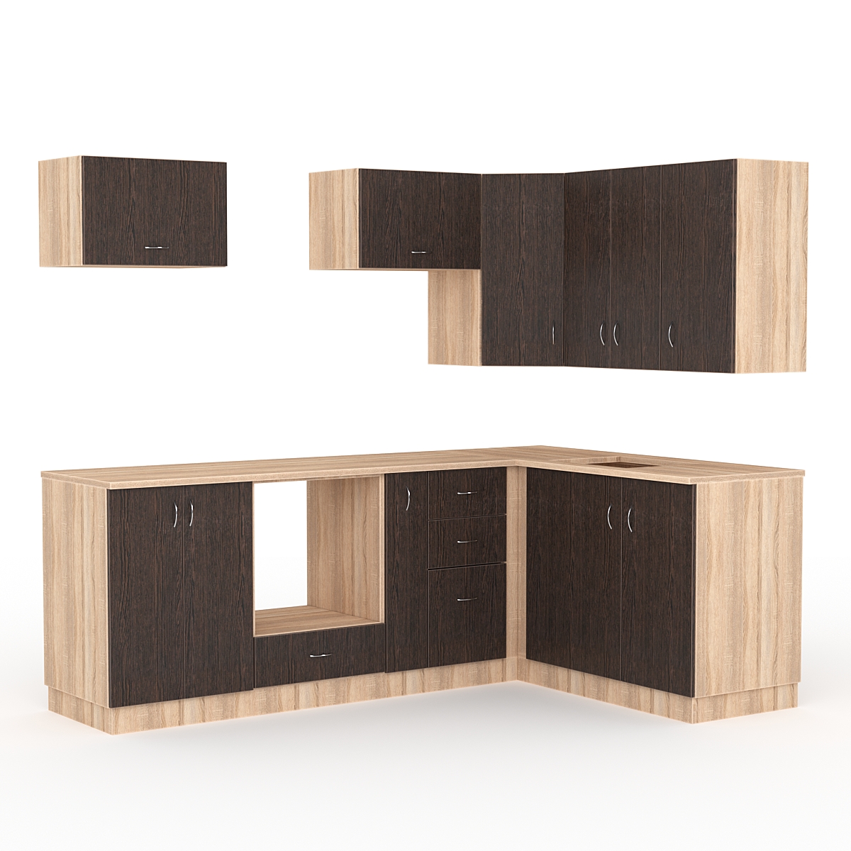 В конструкции можно разместить раковину, плиту и имеется пространство для вытяжки.