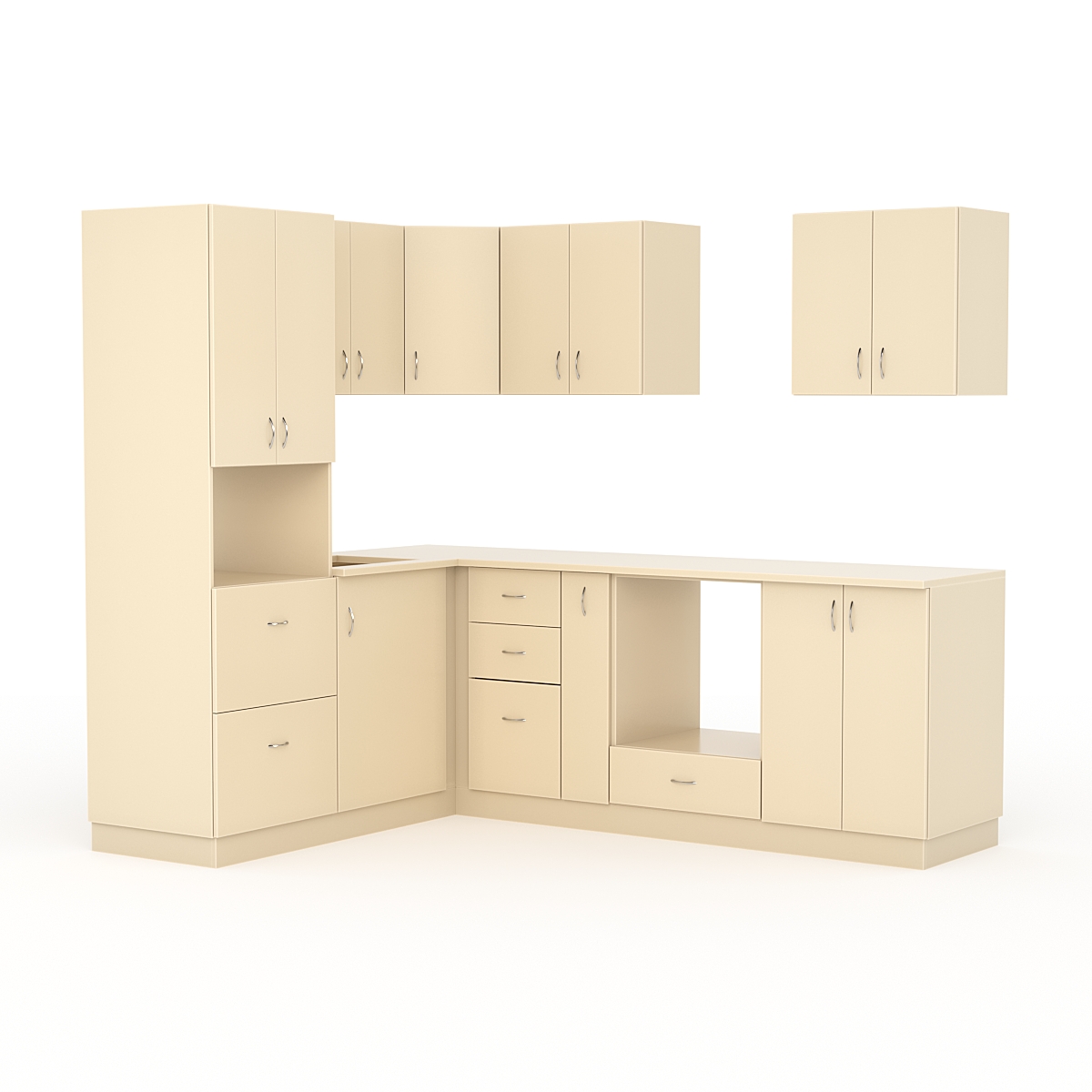 Система оснащена ящиками. Ящики в кухонной гарнитуре используются для хранения посуды, кухонных принадлежностей и других предметов, которые могут понадобиться при приготовлении пищи.